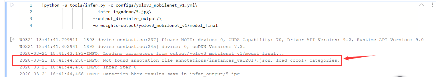 使用自定义的coco数据集,用yolov3模型进行训练,只修改了配置文件中的迭代次数,训练没有问题,但使用%cd PaddleDetection-release-0.2 !python -u tools/train.py -c configs/yolov3_mobilenet_v1.yml \ --use_tb=True \ 运行会出现 Not found annotation file annotatio...