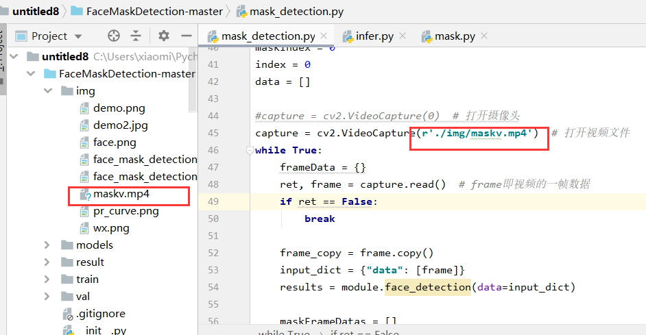 pycharm里运行mask_detection.py检测视频,检测几帧就报错