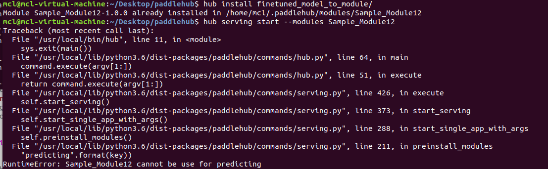根据老师提供的思路,我把自己训练的模型转化成hub可以部署的module,按照模板编写,可以直接预测图片,上图1,可以install成功,但serving start时报cannot be use for predicting,求帮助