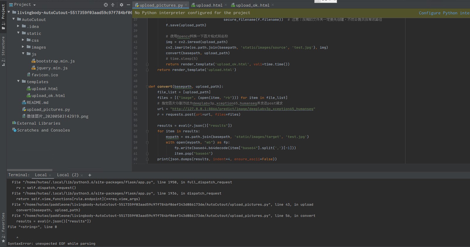 File "/home/hutao/paddleone/livingbody-AutoCutout-5517359f03aad59c97f784bf06ef343d086173de/AutoCutout/upload_pictures.py", line 43, in upload convert(basepath, upload_path) File "/home/hutao/paddleone/livingbody-AutoCutout-5517359f03aad59c97f784bf06ef343d086173de/AutoCutout/upload_pictures.py", line 56, in convert results = eval(r.json()["results"]) File "", line 0