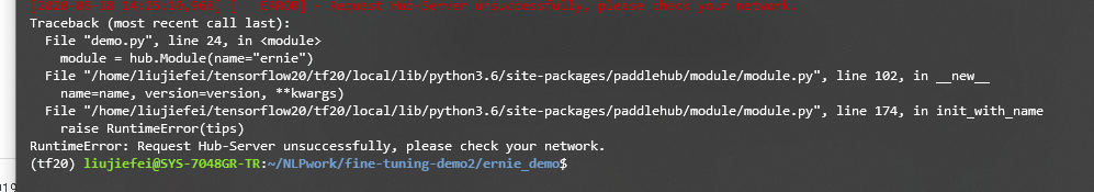 import paddlehub as hub module = hub.Module(name="ernie") 安装的时候无法下载模型 module = hub.Module(name="ernie") File "/home/liujiefei/tensorflow20/tf20/local/lib/python3.6/site-packages/paddlehub/module/module.py", line 102, in new name=name, version=version, **kwargs) File "/home/liujiefei/tensorflow20/tf20/local/lib/python3.6/site-packages/paddlehub/module/module.py", line 174, in init_with_name raise RuntimeError(tips) RuntimeError: Request Hub-Server unsuccessfully, please check your network.