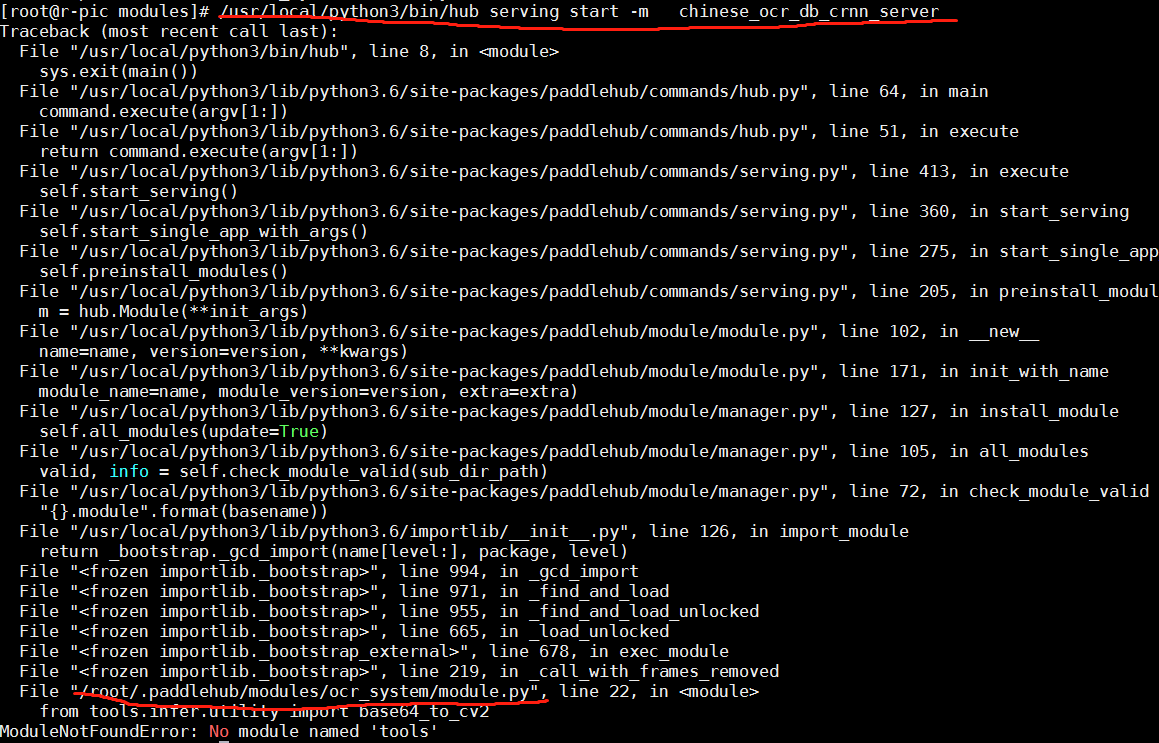 目前在学习PaddleORC , 在使用PaddleHub 过程中 , 当启动 PaddleHub时 会出现当前这个问题,但我并没有在 -m 参数后加入 ocr_system 这个model ,并且我把 ocr_system 删除后 可以正常启动,或者 注释掉 ocr_system/module.py 中的 21行 22行 后,也可以启动成功, 这是不是互相兼容的问题 ,还是我没正确使用 附