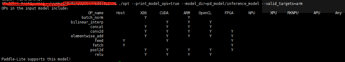 我自己训练的pytorch,转换成onnx模型,再使用X2Paddle工具转换成Paddle的模型(非combined),输入如下命令,测试paddle-lite是否支持模型: