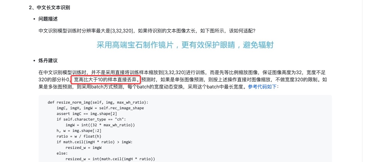 @dyning @ZeyuChen 想请教为何“宽高比大于10的样本直接丢弃”,对比原始CRNN论文的大于10的直接resize为32*320,这样做的优点是什么?