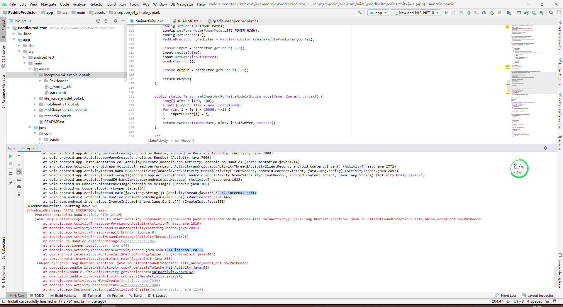 java.lang.RuntimeException: Unable to start activity ComponentInfo{com.baidu.paddle.lite/com.baidu.paddle.lite.MainActivity}: java.lang.RuntimeException: java.io.FileNotFoundException: lite_naive_model_opt.nb/PaxHeader