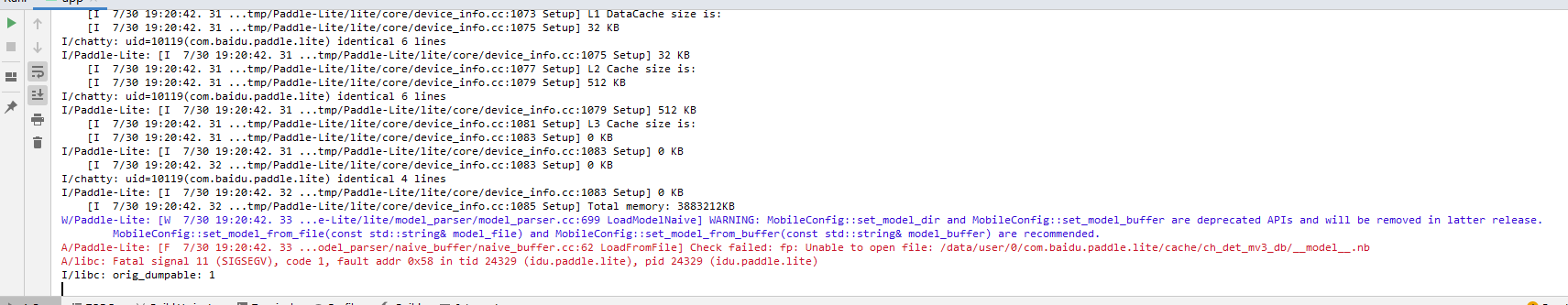 W/Paddle-Lite: [W 7/30 19:20:42. 33 ...e-Lite/lite/model_parser/model_parser.cc:699 LoadModelNaive] WARNING: MobileConfig::set_model_dir and MobileConfig::set_model_buffer are deprecated APIs and will be removed in latter release.