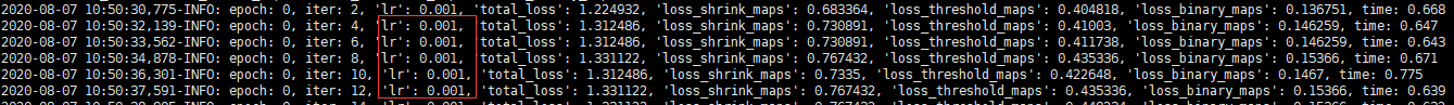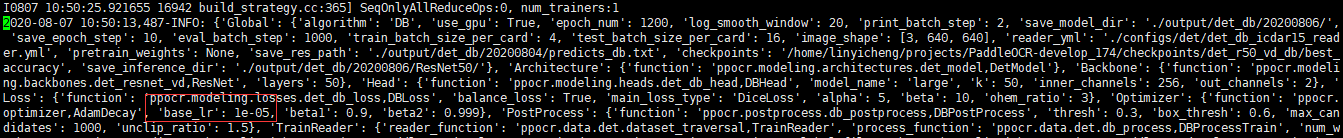 2020-08-07 10:50:41,677-INFO: epoch: 0, iter: 18, 'lr': 0.001, 'total_loss': 1.401952, 'loss_shrink_maps': 0.775264, 'loss_threshold_maps': 0.471727, 'loss_binary_maps': 0.154961, time: 0.649 2020-08-07 10:50:43,021-INFO: epoch: 0, iter: 20, 'lr': 0.001, 'total_loss': 1.44982, 'loss_shrink_maps': 0.804695, 'loss_threshold_maps': 0.474939, 'loss_binary_maps': 0.160919, time: 0.686 2020-08-07 10:50:44,446-INFO: epoch: 0, iter: 22, 'lr': 0.001, 'total_loss': 1.52065, 'loss_shrink_maps': 0.861021, 'loss_threshold_maps': 0.479762, 'loss_binary_maps': 0.17221, time: 0.782 2020-08-07 10:50:45,771-INFO: epoch: 0, iter: 24, 'lr': 0.001, 'total_loss': 1.472782, 'loss_shrink_maps': 0.83159, 'loss_threshold_maps': 0.474939, 'loss_binary_maps': 0.166253, time: 0.694 2020-08-07 10:50:47,053-INFO: epoch: 0, iter: 26, 'lr': 0.001, 'total_loss': 1.472782, 'loss_shrink_maps': 0.83159, 'loss_threshold_maps': 0.474939, 'loss_binary_maps': 0.166253, time: 0.636 2020-08-07 10:50:48,335-INFO: epoch: 0, iter: 28, 'lr': 0.001, 'total_loss': 1.371394, 'loss_shrink_maps': 0.761884, 'loss_threshold_maps': 0.468806, 'loss_binary_maps': 0.152407, time: 0.64 我设置学习率为1e-5,但是训练显示学习率为0.001,由于我是为了增量训练,如此大的学习率会严重影响效果。 2、通过pretrain_weights导入R50的模型参数时,设置学习率为0.0001,实际使用学习率也为0.001,如下图所示。 我想问有什么方法可以修改这个学习率呢 2020-08-05 12:44:51,173-INFO: {'Global': {'algorithm': 'DB', 'use_gpu': True, 'epoch_num': 1200, 'log_smooth_window': 20, 'print_batch_step': 2, 'save_model_dir': './output/det_db/20200804/', 'save_epoch_step': 10, 'eval_batch_step': 1000, 'train_batch_size_per_card': 4, 'test_batch_size_per_card': 16, 'image_shape': [3, 640, 640], 'reader_yml': './configs/det/det_db_icdar15_reader.yml', 'pretrain_weights': './pretrain_models/ResNet50_vd_ssld_pretrained/', 'save_res_path': './output/det_db/20200804/predicts_db.txt', 'checkpoints': '/home/linyicheng/projects/PaddleOCR-develop_174/checkpoints/det_r50_vd_db/', 'save_inference_dir': './output/det_db/20200804/ResNet50/'}, 'Architecture': {'function': 'ppocr.modeling.architectures.det_model,DetModel'}, 'Backbone': {'function': 'ppocr.modeling.backbones.det_resnet_vd,ResNet', 'layers': 50}, 'Head': {'function': 'ppocr.modeling.heads.det_db_head,DBHead', 'model_name': 'large', 'k': 50, 'inner_channels': 256, 'out_channels': 2}, 'Loss': {'function': 'ppocr.modeling.losses.det_db_loss,DBLoss', 'balance_loss': True, 'main_loss_type': 'DiceLoss', 'alpha': 5, 'beta': 10, 'ohem_ratio': 3}, 'Optimizer': {'function': 'ppocr.optimizer,AdamDecay', 'base_lr': 0.0001, 'beta1': 0.9, 'beta2': 0.999}, 'PostProcess': {'function': 'ppocr.postprocess.db_postprocess,DBPostProcess', 'thresh': 0.3, 'box_thresh': 0.6, 'max_candidates': 1000, 'unclip_ratio': 1.5},