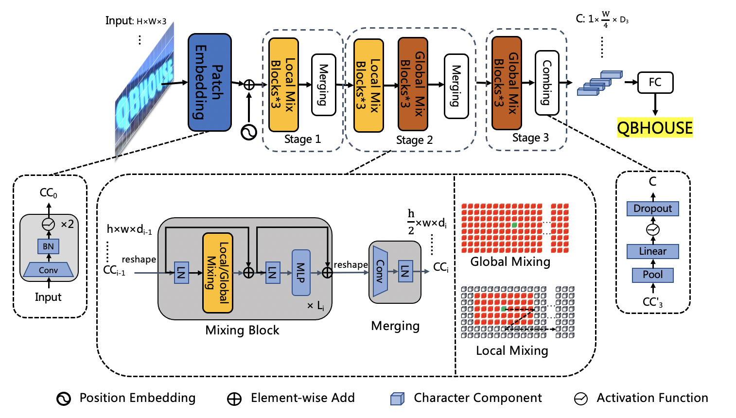 1. Replace the first half of the SVTR network with the first three stages of PP-LCNet, retain 4 Global Mixing Blocks, the accuracy is 76%, and the speedup is 69%. The network structure is as follows: