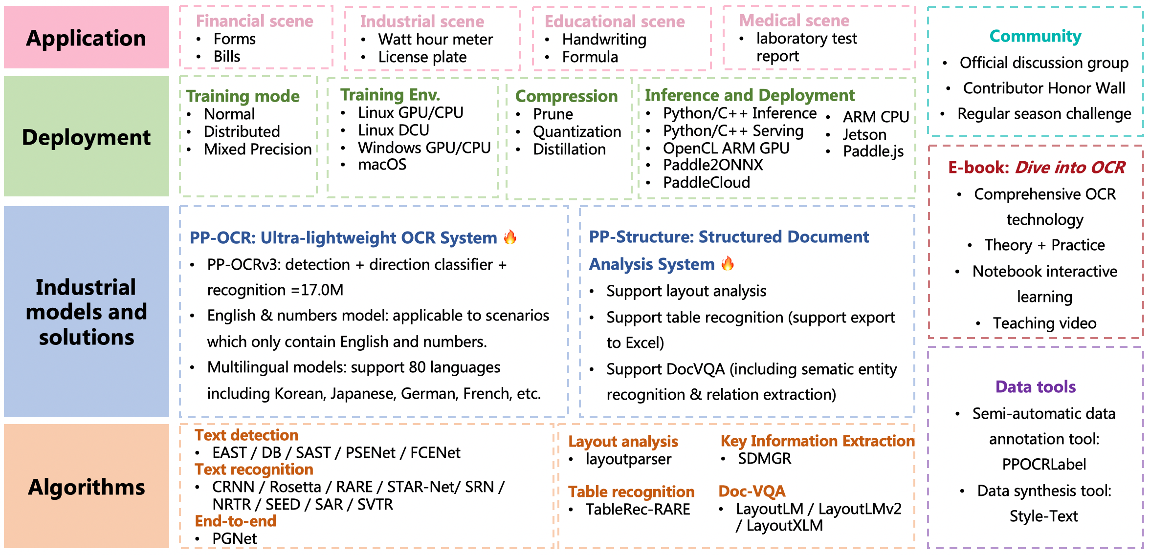 ## Recent updates - **🔥2022.5.9 Release PaddleOCR [release/2.5](https://github.com/PaddlePaddle/PaddleOCR/tree/release/2.5)** - Release [PP-OCRv3](./doc/doc_en/ppocr_introduction_en.md#pp-ocrv3): With comparable speed, the effect of Chinese scene is further improved by 5% compared with PP-OCRv2, the effect of English scene is improved by 11%, and the average recognition accuracy of 80 language multilingual models is improved by more than 5%. - Release [PPOCRLabelv2](./PPOCRLabel): Add the annotation function for table recognition task, key information extraction task and irregular text image. - Release interactive e-book [*"Dive into OCR"*](./doc/doc_en/ocr_book_en.md), covers the cutting-edge theory and code practice of OCR full stack technology. - 2021.12.21 Release PaddleOCR [release/2.4](https://github.com/PaddlePaddle/PaddleOCR/tree/release/2.4) - Release 1 text detection algorithm (PSENet), 3 text recognition algorithms (NRTR、SEED、SAR). - Release 1 key information extraction algorithm (SDMGR, [tutorial](./ppstructure/docs/kie_en.md)) and 3 [DocVQA](./ppstructure/vqa) algorithms (LayoutLM, LayoutLMv2, LayoutXLM). - 2021.9.7 Release PaddleOCR [release/2.3](https://github.com/PaddlePaddle/PaddleOCR/tree/release/2.3) - Release [PP-OCRv2](./doc/doc_en/ppocr_introduction_en.md#pp-ocrv2). The inference speed of PP-OCRv2 is 220% higher than that of PP-OCR server in CPU device. The F-score of PP-OCRv2 is 7% higher than that of PP-OCR mobile. - 2021.8.3 Release PaddleOCR [release/2.2](https://github.com/PaddlePaddle/PaddleOCR/tree/release/2.2) - Release a new structured documents analysis toolkit, i.e., [PP-Structure](./ppstructure/README.md), support layout analysis and table recognition (One-key to export chart images to Excel files). - [more](./doc/doc_en/update_en.md) ## Features PaddleOCR support a variety of cutting-edge algorithms related to OCR, and developed industrial featured models/solution [PP-OCR](./doc/doc_en/ppocr_introduction_en.md) and [PP-Structure](./ppstructure/README.md) on this basis, and get through the whole process of data production, model training, compression, inference and deployment. ![](./doc/features_en.png) > It is recommended to start with the “quick experience” in the document tutorial ## Quick Experience - Web online experience for the ultra-lightweight OCR: [Online Experience](https://www.paddlepaddle.org.cn/hub/scene/ocr) - Mobile DEMO experience (based on EasyEdge and Paddle-Lite, supports iOS and Android systems): [Sign in to the website to obtain the QR code for installing the App](https://ai.baidu.com/easyedge/app/openSource?from=paddlelite) - One line of code quick use: [Quick Start](./doc/doc_en/quickstart_en.md) ## E-book: *Dive Into OCR* - [Dive Into OCR 📚](./doc/doc_en/ocr_book_en.md) ## Community - **Join us**👬: Scan the QR code below with your Wechat, you can join the official technical discussion group. Looking forward to your participation.