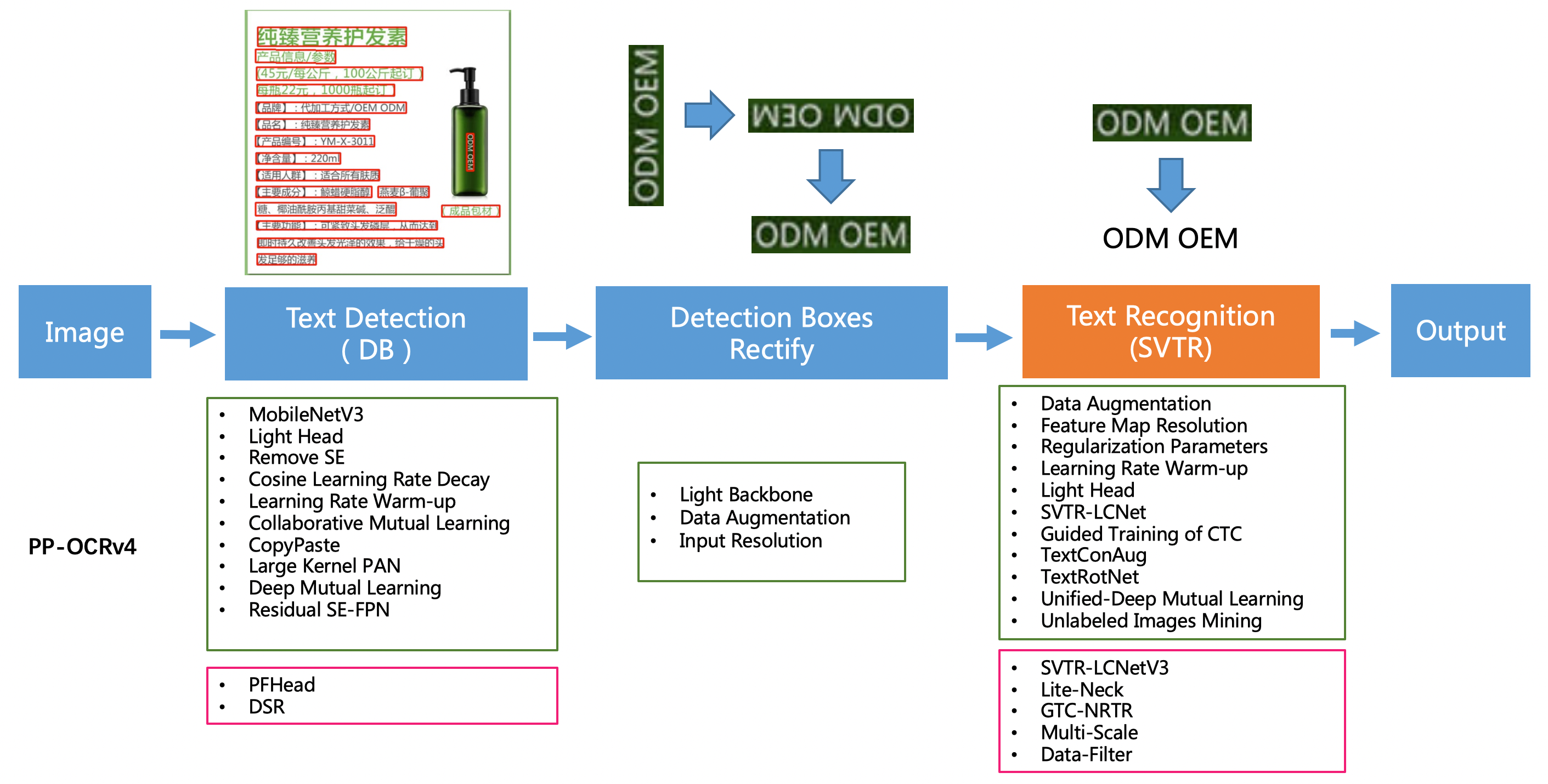 PP-OCRv4在PP-OCRv3的基础上进一步升级。整体的框架图保持了与PP-OCRv3相同的pipeline,针对检测模型和识别模型进行了数据、网络结构、训练策略等多个模块的优化。 PP-OCRv4系统框图如下所示: