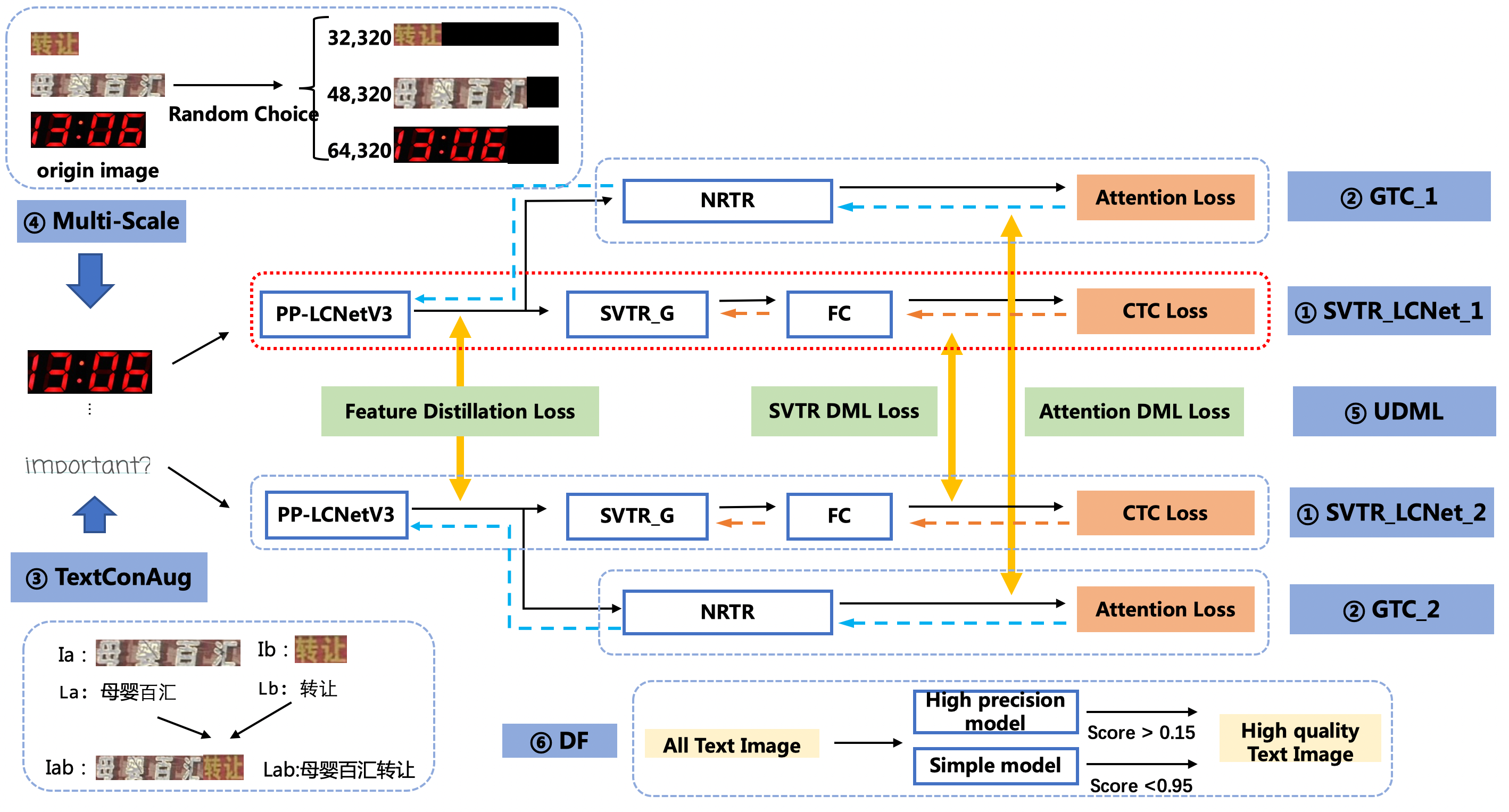 GTC(Guided Training of CTC),是在PP-OCRv3中使用过的策略,融合多种文本特征的表达,有效的提升文本识别精度。在PP-OCRv4中使用训练更稳定的Transformer模型NRTR作为指导,相比SAR基于循环神经网络的结构,NRTR基于Transformer实现解码过程泛化能力更强,能有效指导CTC分支学习。解决简单场景下快速过拟合的问题。模型大小不变,识别精度提升至73.21%(+0.5%)。