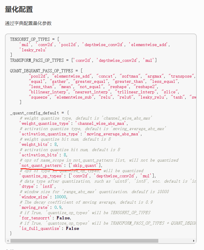 API文档中有一个字典配置量化参数,里面有not_quant_pattern来指定一些pattern可以不量化,可是在quant_post中却并不是通过字典来配置量化参数的,请问quant_post中能指定哪些层不量化么