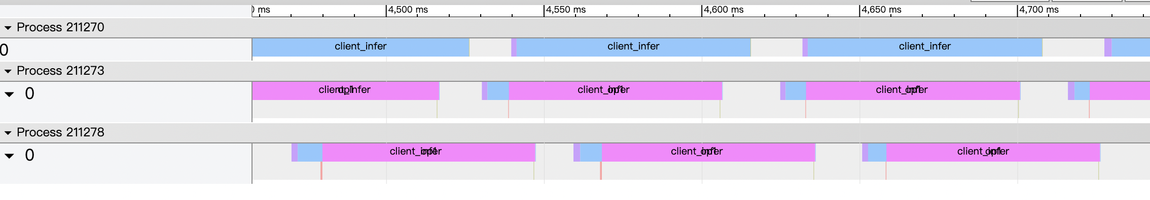 进行profile,图中开了三个进程,每个进程开两个线程连接同一server,不同进程连接不同server。从图看来同一线程里的多个client没有并发起来。