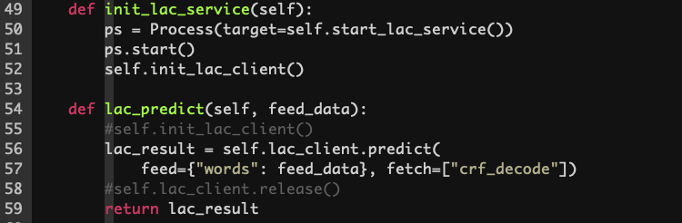 senta示例中使用lac模型做预处理时,如果将lac client只创建不释放,就会在预测时卡住,复现问题可以将senta示例中的代码做如下改动,此时再通过http访问senta任务就会卡住