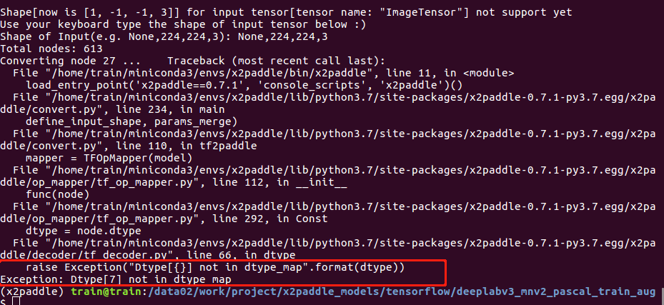 (b) 用命令x2paddle -f tensorflow -m frozen_inference_graph.pb -s pd-model --without_data_format_optimization --define_input_shape, 出现如下错误: