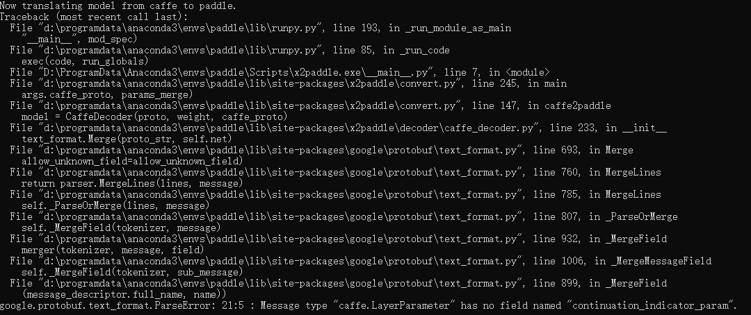 在执行caffee转换的时候出现这个错误,大家有明白的吗,求解释 我的操作命令为: x2paddle --framework=caffe --prototxt=XXX.prototxt --weight=XXX.caffemodel --save_dir=XX