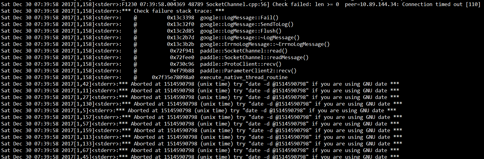 Sat Dec 30 07:39:58 2017[1,158]:F1230 07:39:58.004369 48789 SocketChannel.cpp:56] Check failed: len >= 0 peer=10.89.144.34: Connection timed out [110]