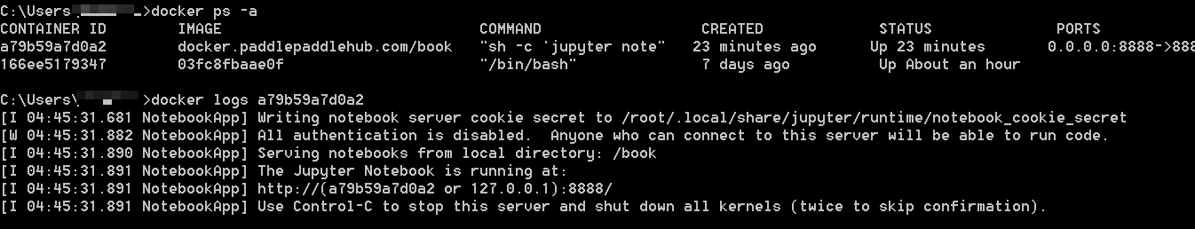 a79b59a7d0a2 docker.paddlepaddlehub.com/book "sh -c 'jupyter note" 23 minutes ago Up 23 minutes 0.0.0.0:8888->8888/tcp sad_williams