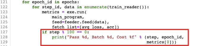 train.py中第128行打印的step和epoch_id顺序似乎反了,一个batch应该是一个step,一个pass应该是一个epoch。 若是按照上图顺序打印,则打印结果奇怪,batch一直为0。