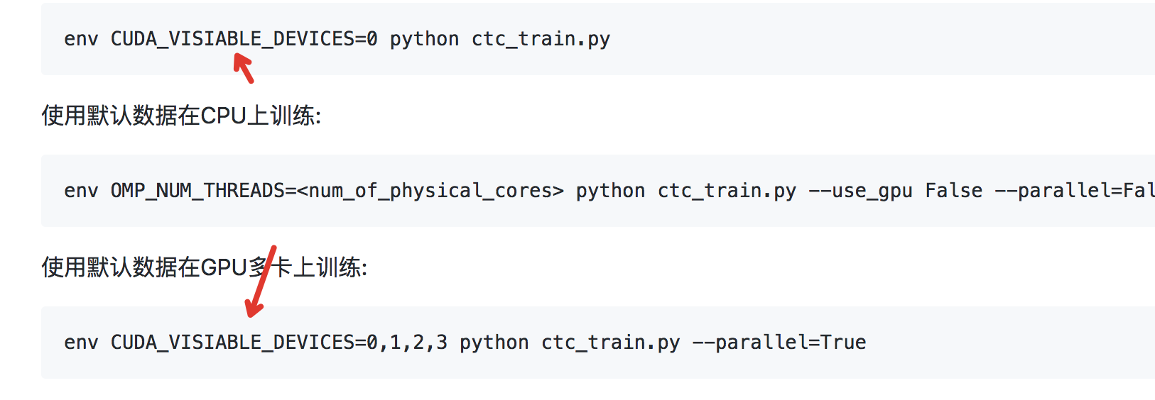 应该是CUDA_VISIBLE_DEVICES=0,1,2,3 说明文档中多了一个A。 还有