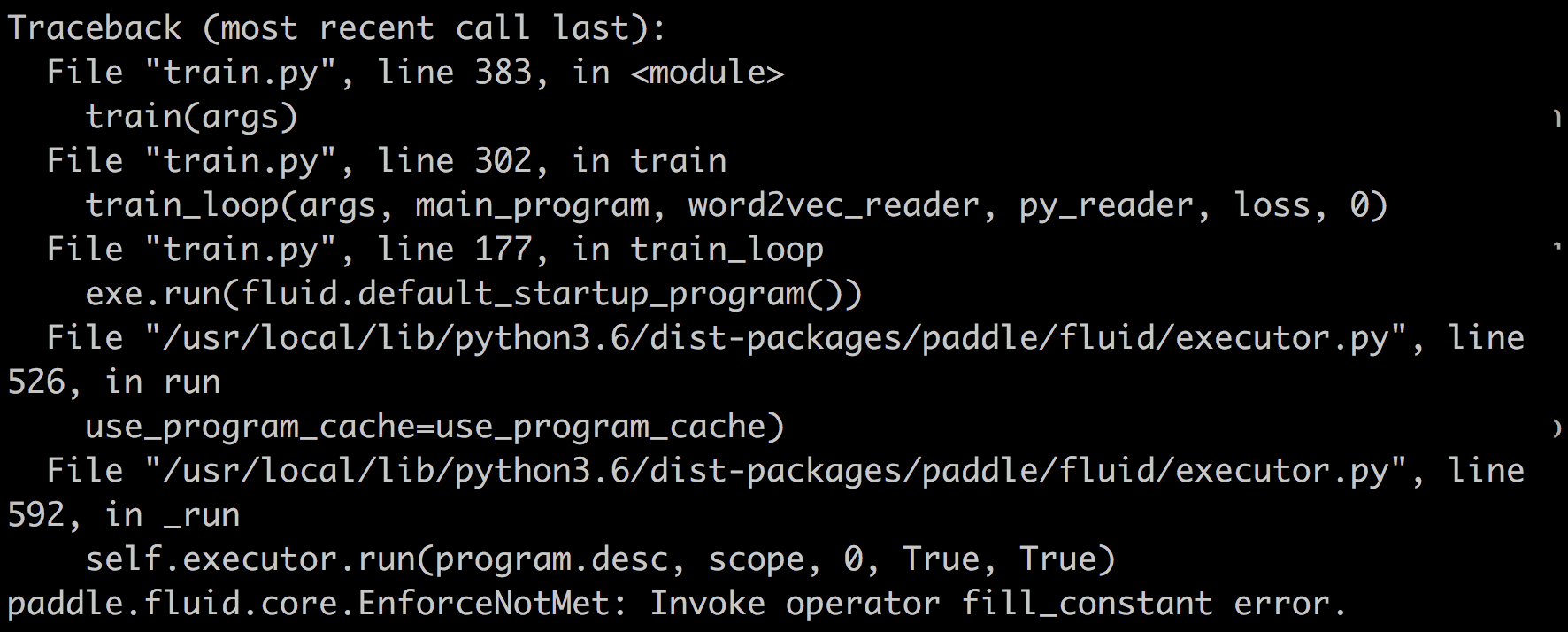 环境:ubuntu16 Cuda8 python2.7 GPU类型: p40 word2vec运行时报operator fill_constant error,截图如下: