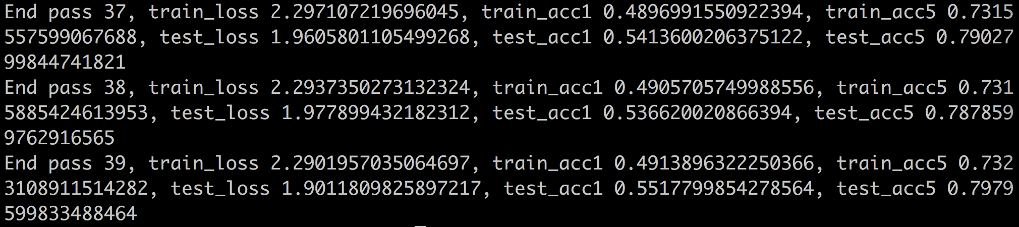 运行了40个pass后依然保持较高的loss,和较低的acc,且变化速度缓慢,如图所示: