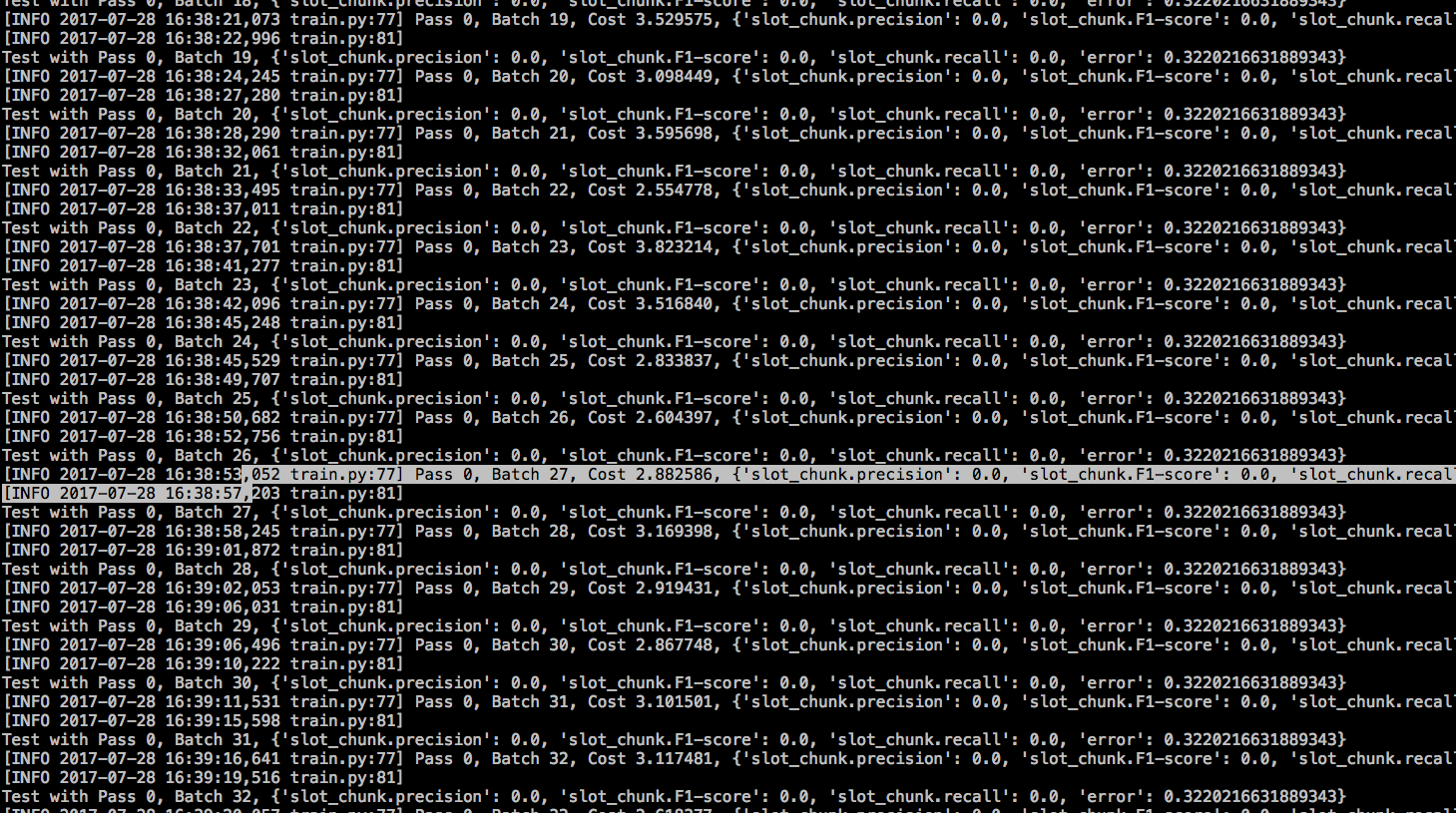 我在实际数据集上运行了一下ner的demo,训练时截图如上图,怎么感觉有问题,有问题的话会出在哪呢?麻烦您看一下,谢谢啦~~ 主要代码和数据: music.zip