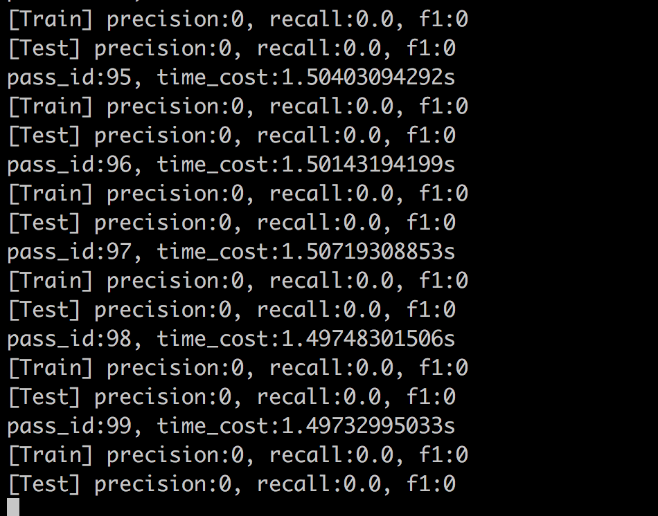 用提供的数据集和参数,在chinese_ner目录下直接跑python train.py, 得到的精度为0(如下图所示),这个是什么原因?