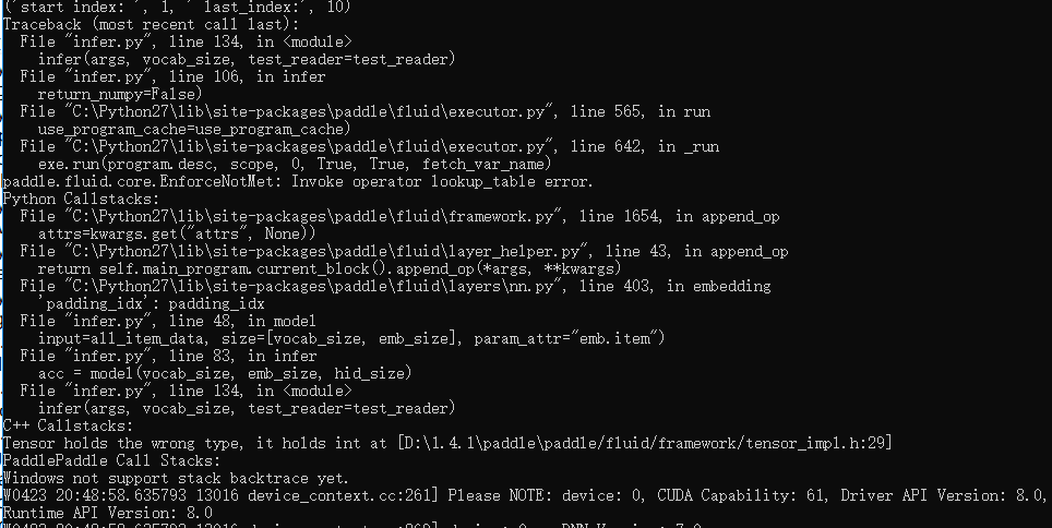 执行指令python infer.py --test_dir test_data --use_cuda 1 --batch_size 50 --model_dir model_output 报错信息如下: Windows not support stack backtrace yet.