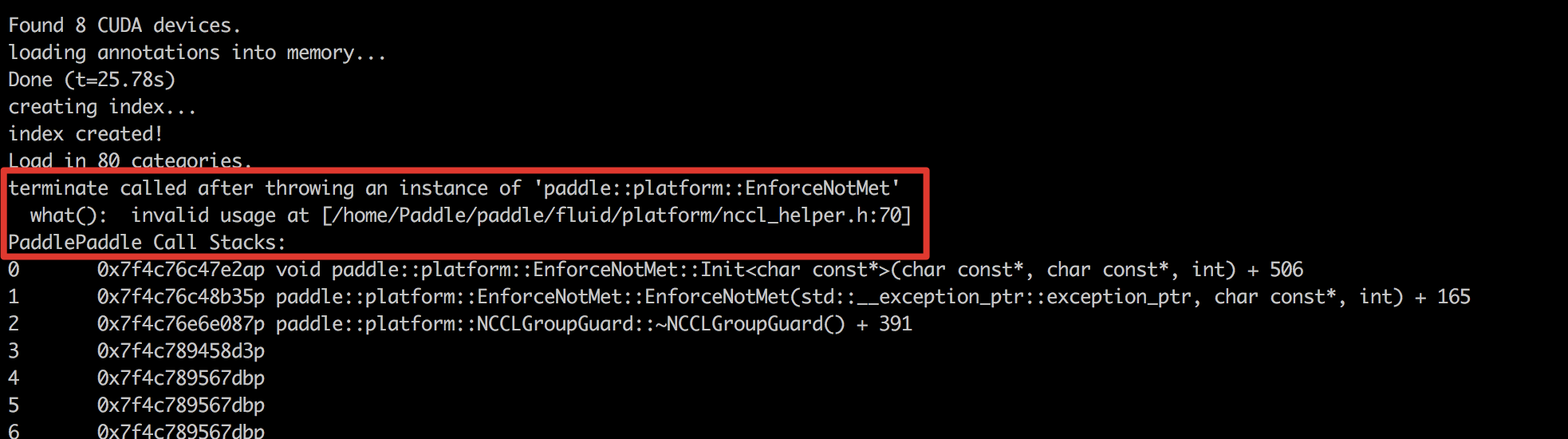 paddle:最新的develop分支代码编译安装; models: 最新的develop代码; 单卡训练没有问题,多卡训练报错。 export CUDA_VISIBLE_DEVICES=0,1,2,3,4,5,6,7 执行 python train.py 报错信息如下: python train.py --syncbn=False 可以跑通