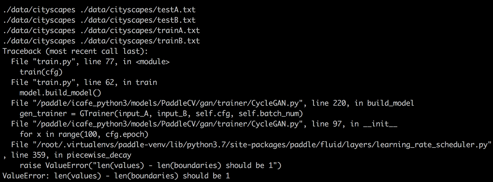 在PaddleCV/gan模型下,执行如下指令python train.py --model_net CycleGAN --dataset cityscapes --batch_size 1 --net_G resnet_9block --g_base_dim 32 --net_D basic --norm_type batch_norm --epoch 100 --load_size 286 --crop_size 256 --crop_type Random,对cyclegan进行训练,报错信息如下: