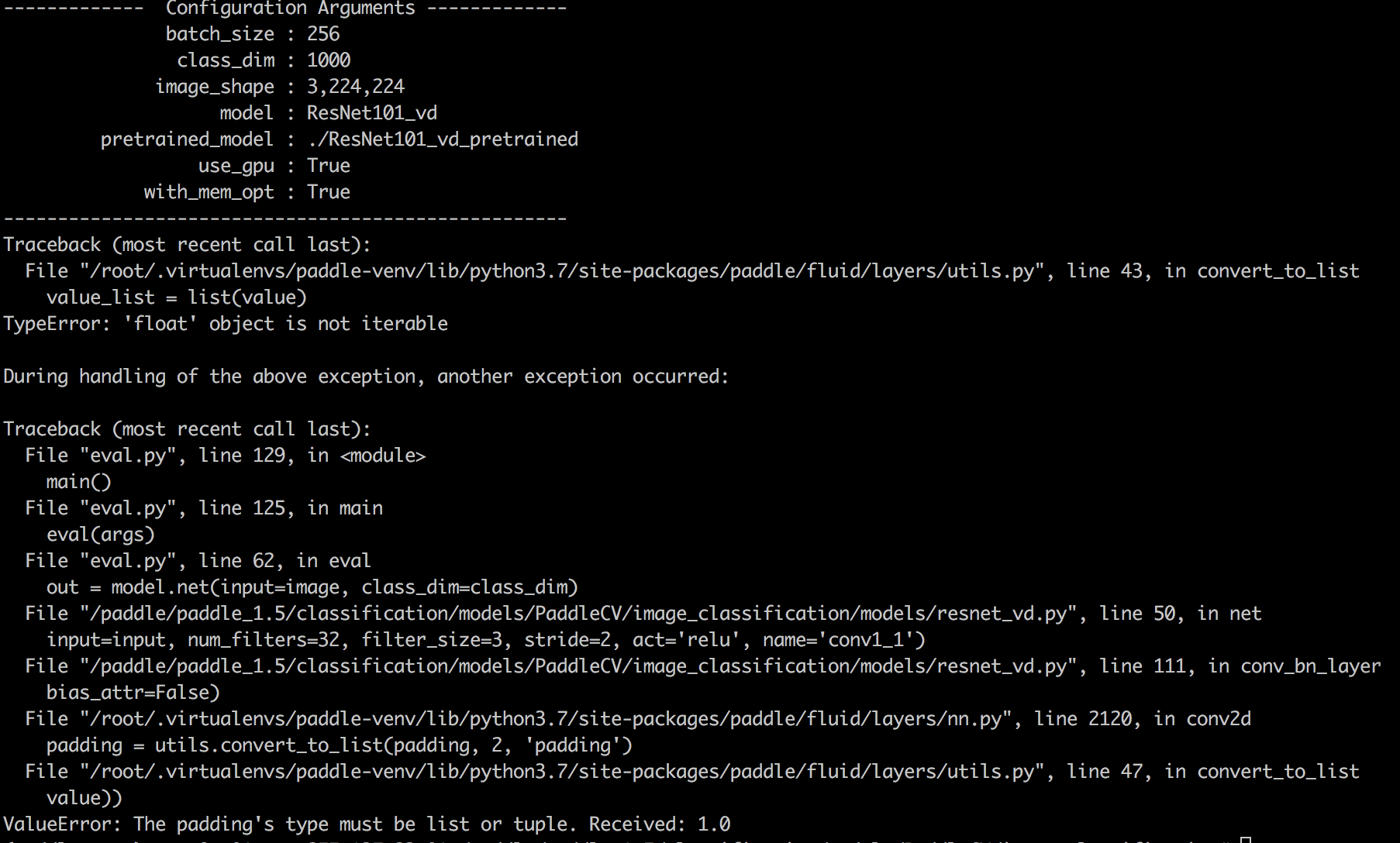 在PaddleCV/image_classification目录下执行python eval.py --model=ResNet101_vd --pretrained_model=./ResNet101_vd_pretrained指令,对下载的预训练模型ResNet101_vd进行评估,报错信息如下: