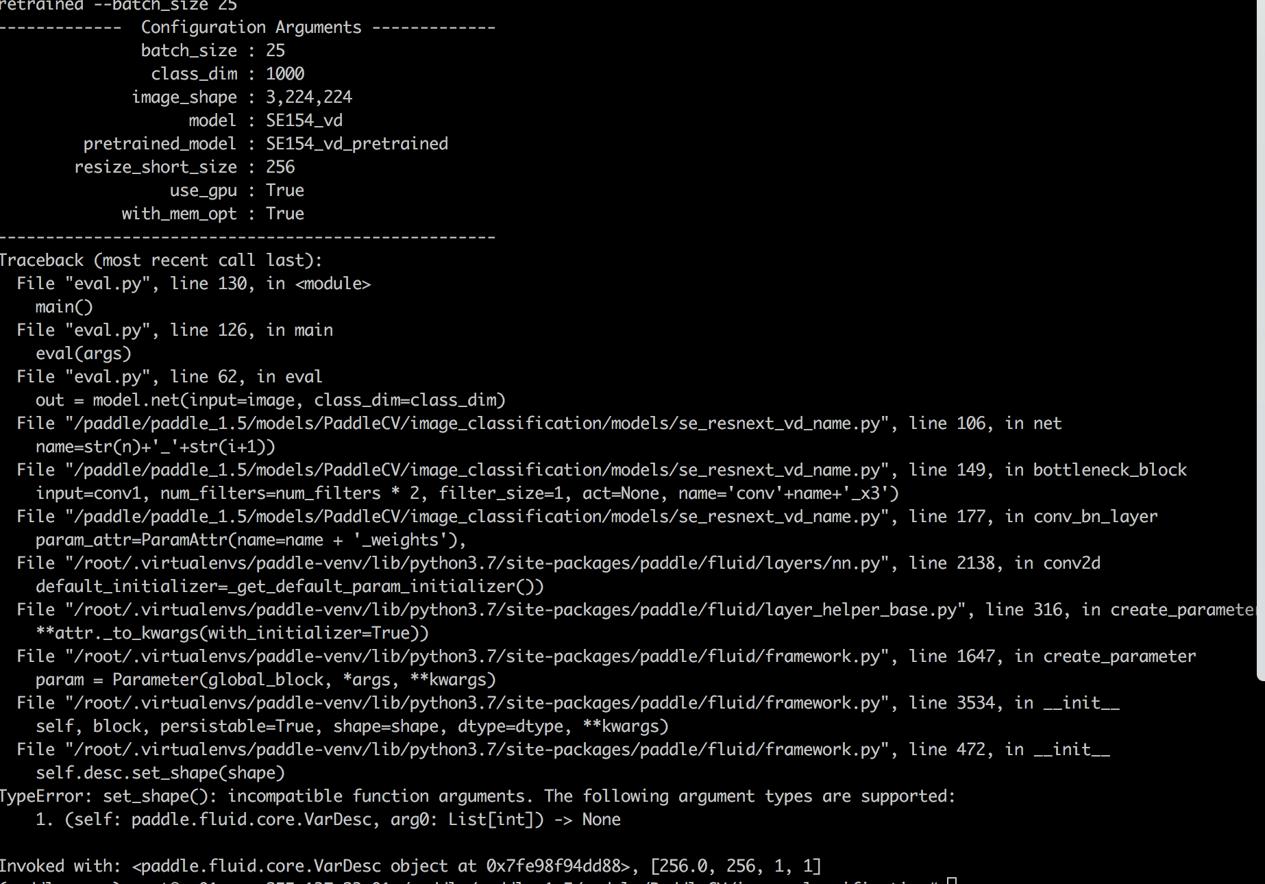 在python3.7环境下,PaddleCV/image_classification目录中下载SE154_vd_pretrained预训练模型,执行指令python eval.py --model SE154_vd --pretrained_model SE154_vd_pretrained --batch_size 25,对该模型进行评估,报错信息如下: