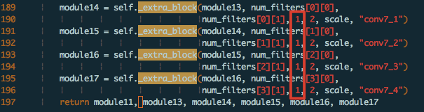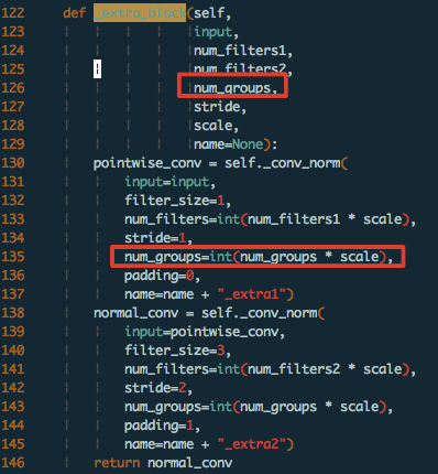 如下图1, 2中,_extra_block 函数调用的地方已经写死 num_groups 为 1,而 scale 参数为传入的,假设 scale < 1,比如 0.5 或者 0.25,则会出现调用 self._conv_norm 的时候 num_groups 为 0 的情况。