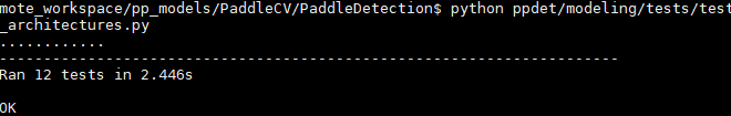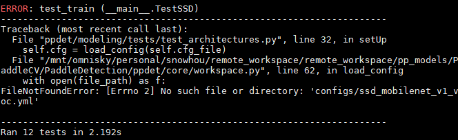 运行python ppdet/modeling/tests/test_architectures.py出现如下错误 下图test_architectures.py中ssd_mobilenet_v1_voc.yml的路径应改为configs/ssd/ssd_mobilenet_v1_voc.yml 修改后测试 OK
