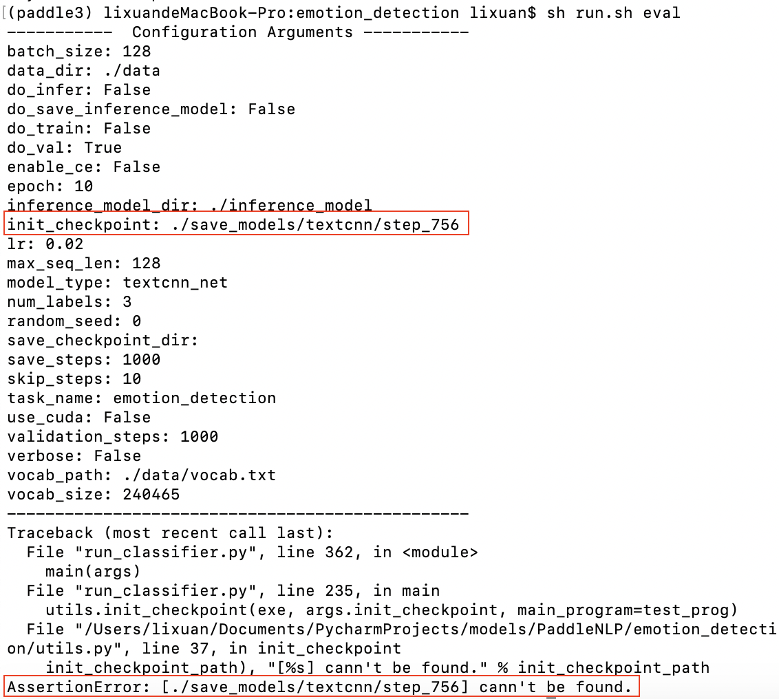 PaddleNLP/emotion_detection/项目我还没有修改模型代码,运行官方评估代码时出错,如图 但,保存的模型下是有正确存放该模型参数的,如图 请问,这是什么问题呢?