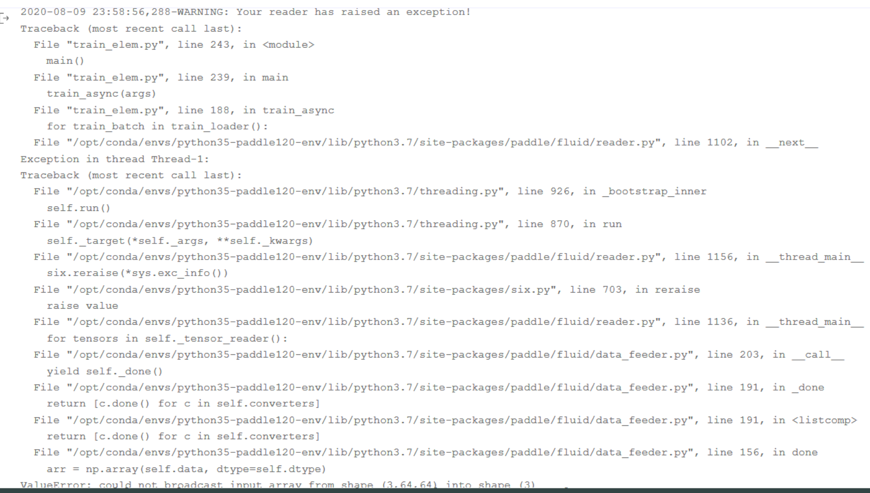 有时候训练到两千多轮、有时候训练到六千多七千多轮 还有的时候训练开始就会 我把batch已经调到非常小,这个问题也还会出现,改了好几次代码 也没起作用 运行七八个小时结果出错 这个错误成本太大了 这是框架问题吗? Valuerror: could not broadcast input array from shape (3,64,64) into shape (3) 完整的错误栈大概是下面这样 2020-08-09 23:14:23,889-WARNING: Your reader has raised an exception! Exception in thread Thread-1: Traceback (most recent call last): File "/opt/conda/envs/python35-paddle120-env/lib/python3.7/threading.py", line 926, in _bootstrap_inner self.run() File "/opt/conda/envs/python35-paddle120-env/lib/python3.7/threading.py", line 870, in run self._target(*self._args, **self._kwargs) File "/opt/conda/envs/python35-paddle120-env/lib/python3.7/site-packages/paddle/fluid/reader.py", line 1156, in thread_main six.reraise(*sys.exc_info()) File "/opt/conda/envs/python35-paddle120-env/lib/python3.7/site-packages/six.py", line 703, in reraise raise value File "/opt/conda/envs/python35-paddle120-env/lib/python3.7/site-packages/paddle/fluid/reader.py", line 1136, in thread_main for tensors in self._tensor_reader(): File "/opt/conda/envs/python35-paddle120-env/lib/python3.7/site-packages/paddle/fluid/data_feeder.py", line 203, in call yield self._done() File "/opt/conda/envs/python35-paddle120-env/lib/python3.7/site-packages/paddle/fluid/data_feeder.py", line 191, in _done return [c.done() for c in self.converters] File "/opt/conda/envs/python35-paddle120-env/lib/python3.7/site-packages/paddle/fluid/data_feeder.py", line 191, in return [c.done() for c in self.converters] File "/opt/conda/envs/python35-paddle120-env/lib/python3.7/site-packages/paddle/fluid/data_feeder.py", line 156, in done arr = np.array(self.data, dtype=self.dtype) ValueError: could not broadcast input array from shape (3,64,64) into shape (3)