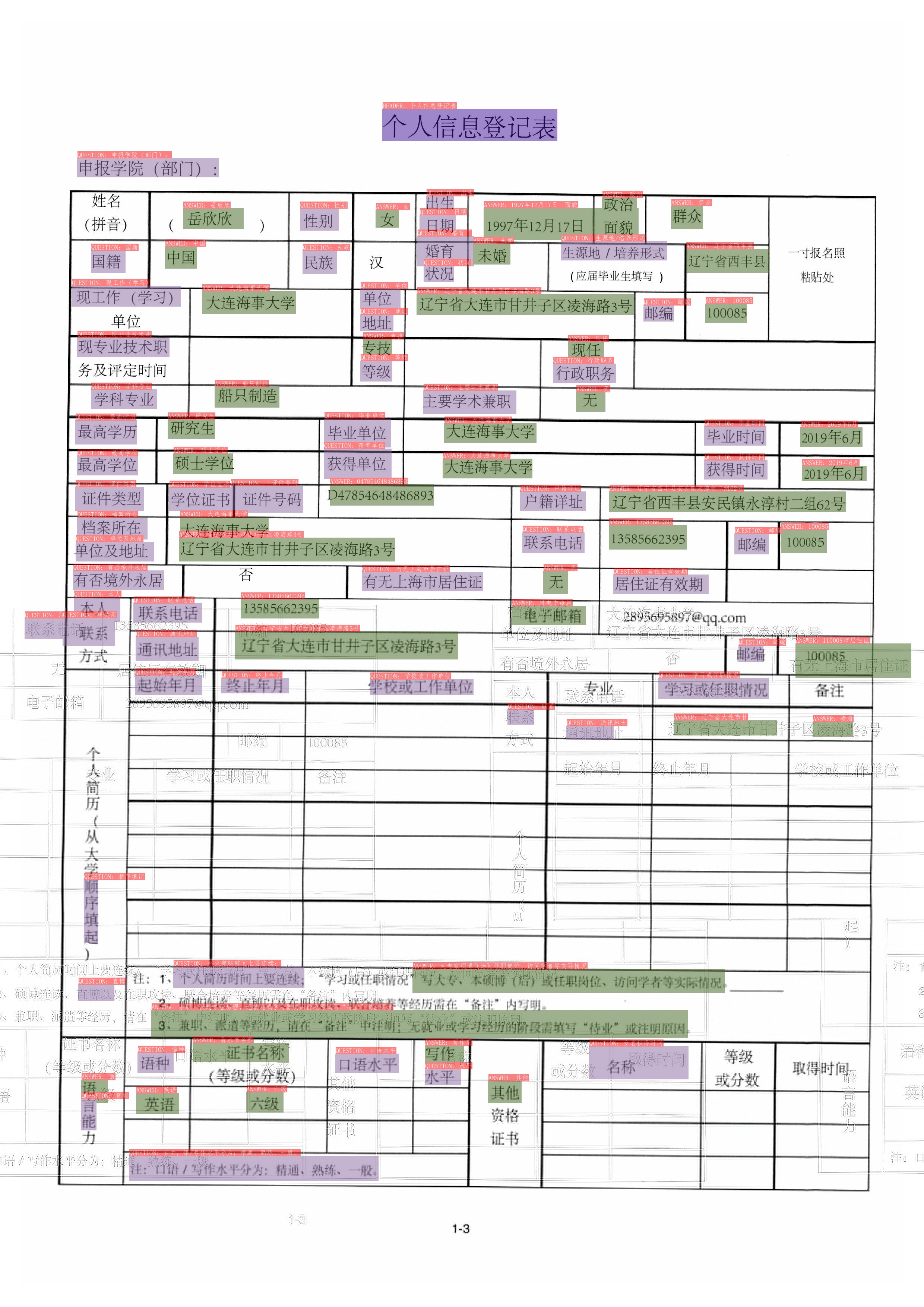 Boxes with different colors in the figure represent different categories. For the XFUND dataset, there are 3 categories: `QUESTION`, `ANSWER`, `HEADER`
