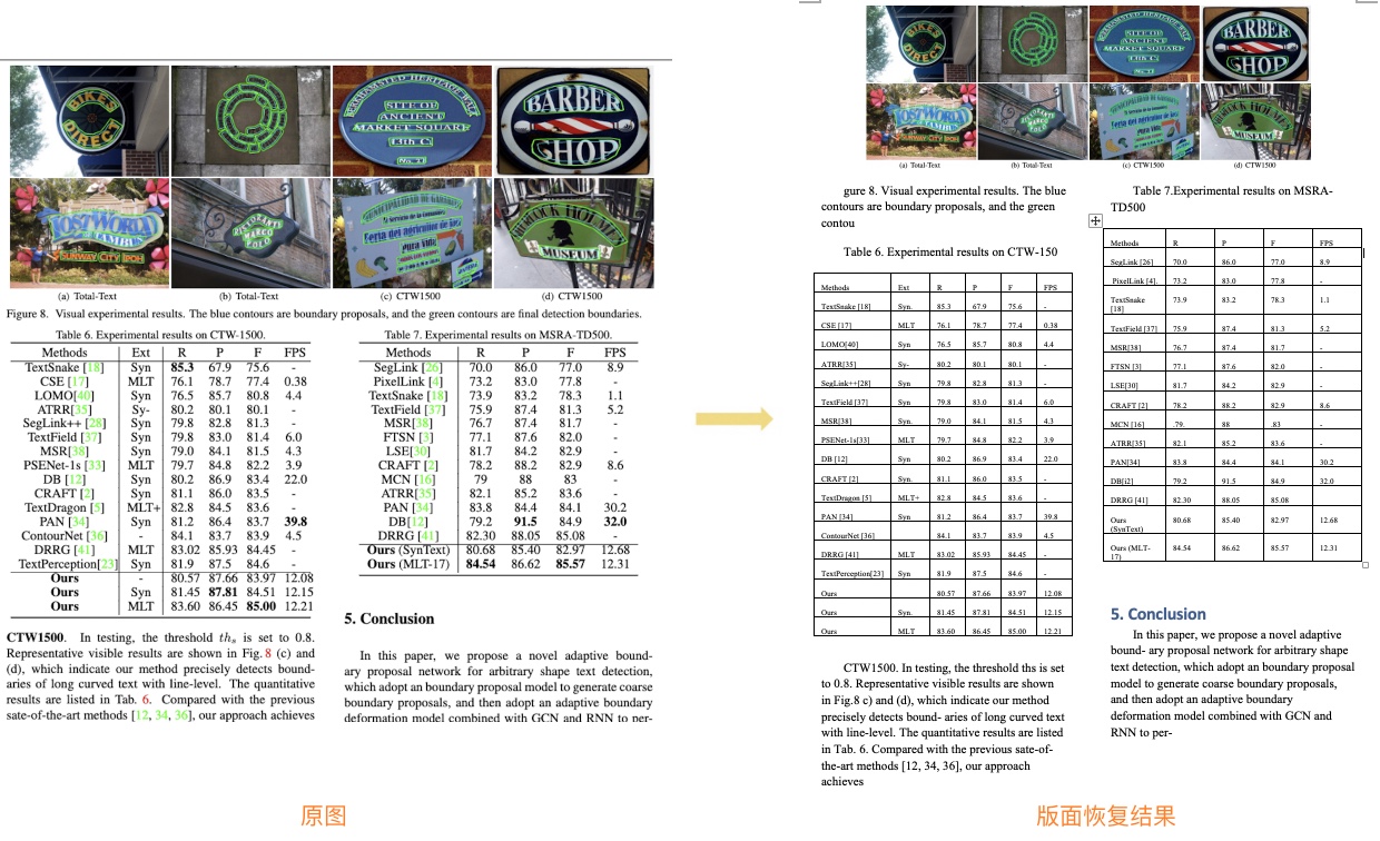 版面恢复就是在OCR识别后,内容仍然像原文档图片那样排列着,段落不变、顺序不变的输出到word文档中等。