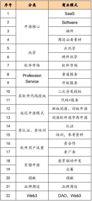 Apache 基金会成员、Apache Dolphin Scheduler PMC郭炜(郭大侠)在2022年10月25日开源中国的博客《史上最全!全球 22 种开源商业收入模式 》一文中总结了全球大部分开源项目形成收入的商业模式,一共 22 种的模式,具体如下图: