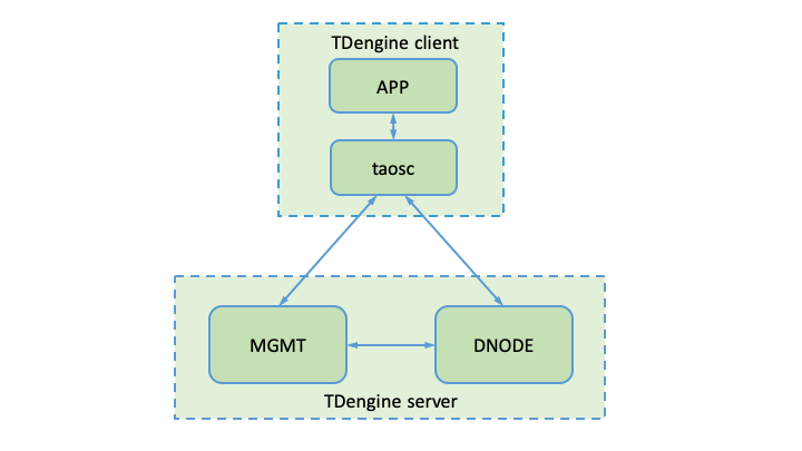 There are two main modules in TDengine server as shown in Picture 1: Management Module (MGMT) and Data Module(DNODE). The whole TDengine architecture also includes a TDengine Client Module.
