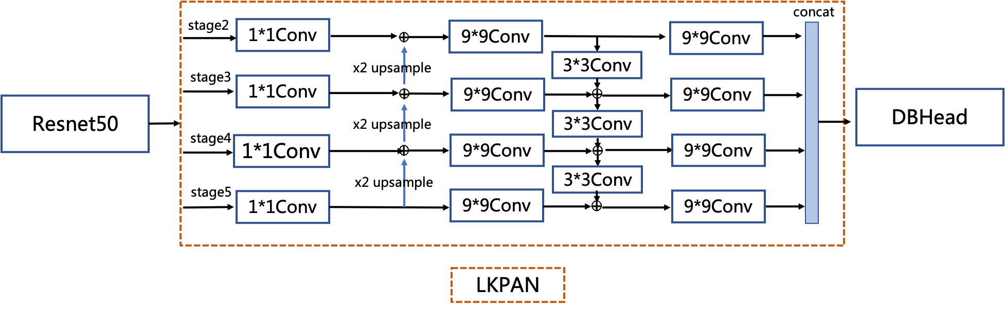 LK-PAN (Large Kernel PAN) 是一个具有更大感受野的轻量级[PAN](https://arxiv.org/pdf/1803.01534.pdf)结构,核心是将PAN结构的path augmentation中卷积核从`3*3`改为`9*9`。通过增大卷积核,提升特征图每个位置覆盖的感受野,更容易检测大字体的文字以及极端长宽比的文字。使用LK-PAN结构,可以将教师模型的hmean从83.2%提升到85.0%。