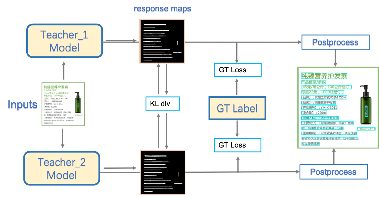 [DML](https://arxiv.org/abs/1706.00384) (Deep Mutual Learning)互学习蒸馏方法,如下图所示,通过两个结构相同的模型互相学习,可以有效提升文本检测模型的精度。教师模型采用DML策略,hmean从85%提升到86%。将PP-OCRv2中CML的教师模型更新为上述更高精度的教师模型,学生模型的hmean可以进一步从83.2%提升到84.3%。